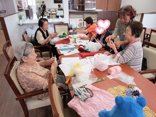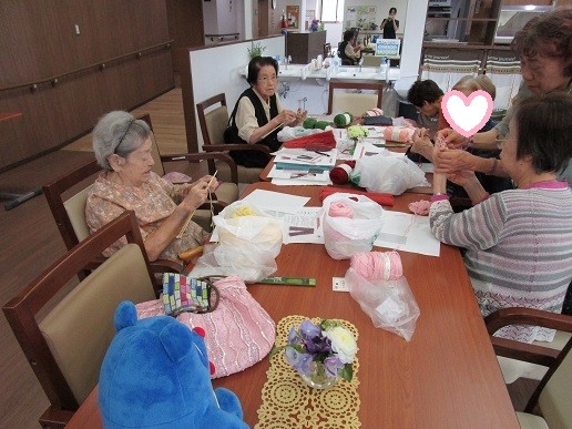 編み物倶楽部は、毎月1回、ボランティアの講師をお招きし製作活動に勤しんでいます。
