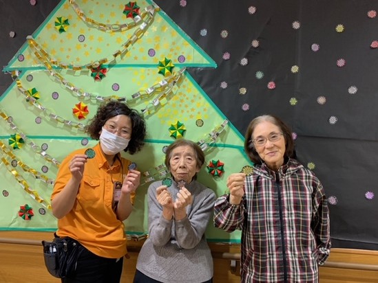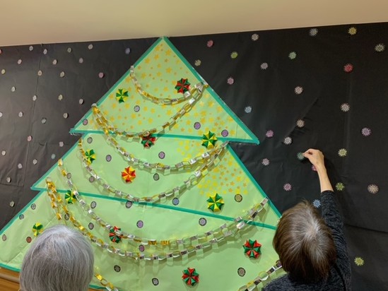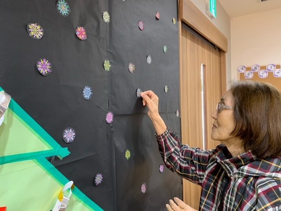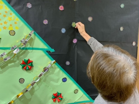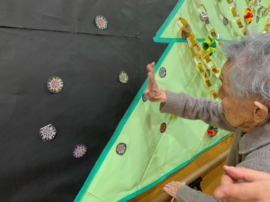さて、クリスマスに向けてご利用者様と一緒に大きなツリーを作り、雪の結晶が大量にあったのでカラフルに色を塗り飾りました
