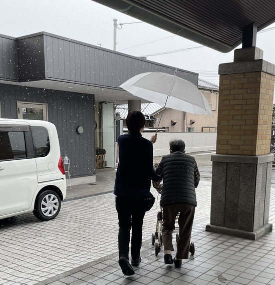 雪の中の送迎も傘を差して安心・安全に行っています