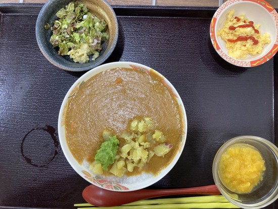 メニューはサツマイモのカレー、ミニオムレツ、キュウリのサラダ、フルーツ