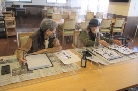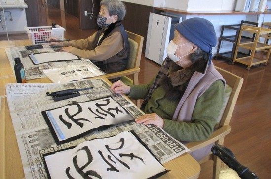2022年01月29日(土) 書初め こんにちは。 6階フロアです(*^_^*) 前回の6階フロアのブログで最後に ”秘密”とした内容ですが 先日行うことができました それは・・・ ”書初め”です! お正月の恒例行事 子どもの頃は宿題として出ることもありましたが 大人になるとめっきり機会がなくなりました 最初は 「うまく書けんからなぁ・・・(´_ゝ`)」 と渋い顔をしていたM様とK様ですが なんでも好きなこと書いてみてください!とお伝えすると・・・ 今年の目標よ!とM様 私はお手本を見て書くね!とK様 それぞれ個性が出ていてステキです 今年も”元気”で楽しい1年にしましょう随時、ブログ更新中! 「アルファリビング松山久万の台」のブログは・・・ /kumanodai/blog/ 「アルファリビング松山よつば」のブログは・・ /yotsuba/blog/
