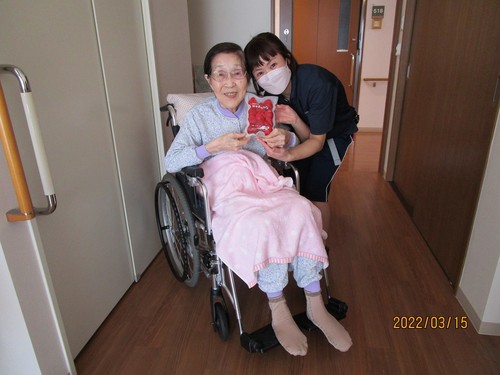 2022年05月06日(金) 家族様からの差し入れ☆ ご入居者様にとって食べることは 楽しみの一つでもあります久しぶりにあそこのケーキが食べたいなー 今が旬の果物が食べたいなー めったに食べれん巻き寿司食べたいなと入居者様からの声が聞こえると その思いを叶えたくなります♡♡先日N様が「苺が食べたい」 「よく買ってきよったケーキが食べたい」と訪問中に言われており家族様にご相談し 差し入れを持ってきていただきました。 昼食後に苺を見て・・・素敵な笑顔でした♡「おいしいなー。大きくて綺麗な色やな」綺麗に食べられていました モンブランも美味しそうに食べておられ、 私たちも嬉しかったです♡ そして4月にお誕生日を迎えられたN様♡アルファリビング松山本町毎月恒例の お誕生日プレゼントは・・・ 4月担当スタッフさんが厳選したプレゼント「かわいらしいな♡」 「私の好きな猫ちゃんや」 このクッションを持ってリラックスされています家族様・私たちスタッフからの想いがN様に 届いてたらうれしいです♡