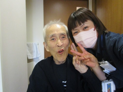 2023年11月30日(木) 毎日の日課♪ みなさんが当たり前のようにしている「歯磨き」ですが、 口腔ケアは口の中の細菌が減るために細菌を含む唾液や食べ物が誤嚥され、肺などに細菌が侵入することで発症する誤嚥性肺炎を防ぐこと事ができます。 それだけではなく、脳梗塞や心筋梗塞の予防にもなります。 その重要さを学んで、毎食後に口腔ケアが追加となったk様の訪問のご紹介します♪ 昼食後、居室に伺うとベットで横になってテレビを見られているk様に「歯磨きしましょう」と声かけします。 「これに乗ったらいい?」と車椅子に移乗され、 洗面台まで見守ります。 丁寧に磨かれています。時々、「磨けたかな?」と スタッフに確認されています。 「きれいになったから写真撮りましょう」と言うと 「歯を見せとこうか」とk様♥ 毎日の日課で、k様の健康を守りたいです!!