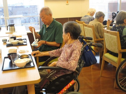 2024年09月04日(水) ご夫婦でいつも・・♥ 朝食時の様子の続きですが、ご夫婦で入居されている方をご紹介します♥ ご主人様が奥様の車椅子を押して毎日レストランに来られています。レストランに来られると「はーい、おはよう!」「今日は早出?えらいねー」とほめていただくのが私の楽しみ(笑) 席につかれると、ご主人様が奥様にお茶を入れます。 その次は、ティッシュを用意されます。 その次は、漬物や佃煮を食卓に用意され、食前薬を飲まれます。奥様はそれが終わるまで必ず待っています♥ タイミングよく写真は撮れなかったのですが、 お薬を飲んだら2人で一緒に「いただきます」と 言ってからお箸を手に取って食事されるのが k夫婦の日課です♥ ご主人の優しさ・奥様からご主人への配慮、そんな姿が見られます!(^^)! 食後は「さあ、今日は天気もええし、買い物日和りやね」と目の前にあるフジを見て言われるご主人様。 「私はデイサービスやな」と奥様です♥ 毎日の光景が、変わらず毎日続きますように☆彡 随時、ブログ更新中! 「アルファリビング松山久万の台」のブログは・・・ /kumanodai/blog/ 「アルファリビング松山よつば」のブログは・・ /yotsuba/blog/
