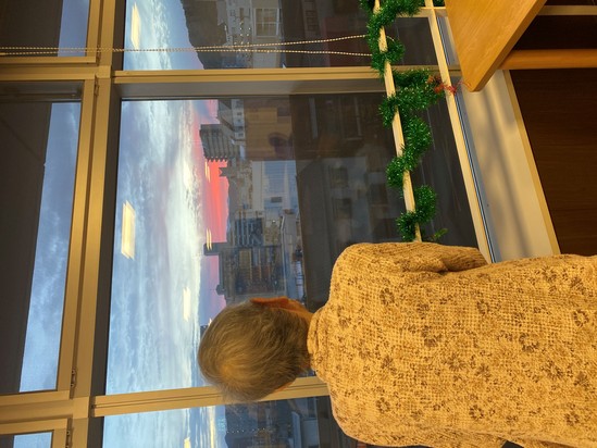時間は7時ごろで、外はまだ少し暗かったですが、朝焼けが少し見えていました