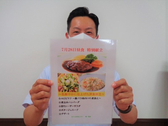 2022年07月24日(日) 来週のメニュー(^o^) みなさんこんにちは とうふです(^o^)丿 来週のメニュー表をお届けに来ました それでは、どうぞ(^o^) 白糸タラの揚げ浸しやとんかつなど 元気の出そうなものがいっぱいですね そして、28日にはイベント食 内容は… エビピラフに煮込みハンバーグ どちらもおいしそうですね(´▽`*) 28日が楽しみです byとうふ「アルファリビング松山本町」のブログは・・ /honmachi/blog/「アルファリビング松山よつば」のブログは・・ /yotsuba/blog
