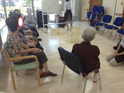 座った席から新聞紙で作ったボールを