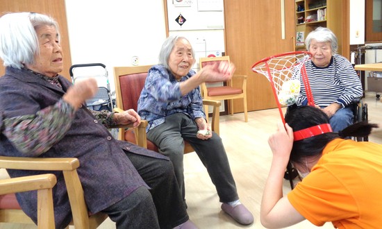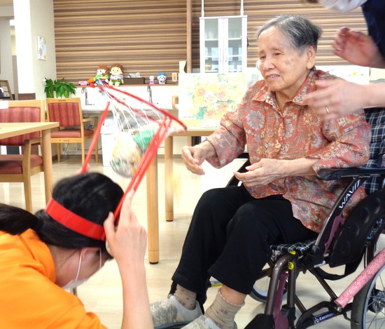 皆さんそれぞれの身体機能に合わせて、ひとりずつ行うやさしい玉入れです