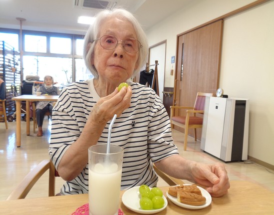 シャインマスカット自体を「初めて見た」「初めて食べた」「こんなぶどうがあるんや」と言った声が多く聞かれ、「皮ごと食べられますよ~」とお伝えしても、皮を出されたりしていましたが(;^ω^) 喜んで頂けて職員一同も嬉しい気持ちになりました♪♪