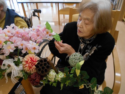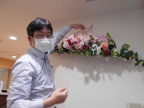 施設長が玄関に飾りつけ。
