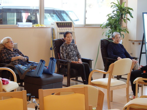 新しい建物に喜ばれて、デイサービスの中の道具や機器にも触れていただきました。