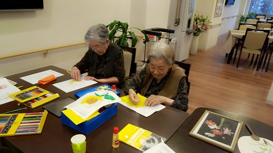 2016年06月04日(土) 塗り絵に貼り絵 こんにちはアルファリビング福岡原です本日は久しぶりに雨模様の1日となりましたねさて施設では午後から夏を先取り向日葵を題材に貼り絵と塗りを行いました貼り絵となるとより細かな作業が必要となりますが集中して取り組んでおられました