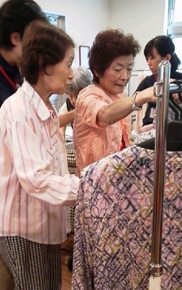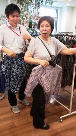 皆様、手に取り、体にあててみたり、試着したり