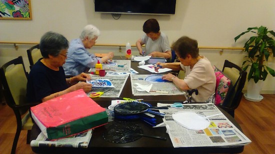 2016年09月04日(日) 納涼祭に向けて☆ミ こんにちは台風が近づいていますね 今日のレクレーションでは納涼祭にむけてうちわ作りをしました みなさん黙々と作られていました 9月18日(日)12時からです! 楽しみですね