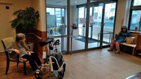 玄関から外を眺めるおふたり
