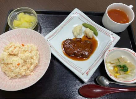 2022年10月31日(月) ☆ ハロウィン② ☆ 今日はハロウィン 昼食もハロウィンにちなんだ メニューでした カボチャの形のハンバーグ と 濃厚なトマトのスープ、 うまみ溢れるキャロットライス 見た目も味も とても良かったです