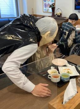 2022年10月31日(月) ☆ ハロウィン③ ☆ 10/31の昼食時、 なにやら怪しい人物が… 台車で運ばれ、 レストランに登場したのは… ちょっとわかりづらいかもしれませんが、 福岡県嘉麻市出身の将棋棋士、 一世を風靡したひ〇みんの マスクをつけた施設長です (笑) レストラン内では、 笑い声に交じり、悲鳴もちらほら… 入居者様に話しかけています 「ちょっと、ヤダー(笑)」と 嬉しそうに拒否されていました このお面、前が見えにくく 呼吸ができないそうですよ~ (◎_◎;)