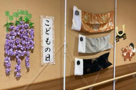 2023年04月30日(日) ☆ 明日から5月 ☆ 施設内の飾りも5月用に チェンジしました こいのぼりは 職員がおばあ様から頂いた 着物の帯で作りました 金太郎とクマもいます 立派な兜も全て手作りです 藤の花も折り紙で作りました ご入居者様に 「季節感があって、いいね~!」 と言っていただきました 外出が難しい方もいらっしゃるので 施設内の装飾で 四季の移り変わりを 感じていただけたらいいなと 思っています