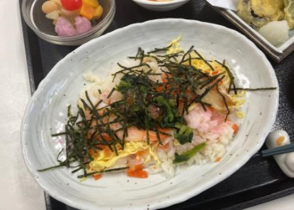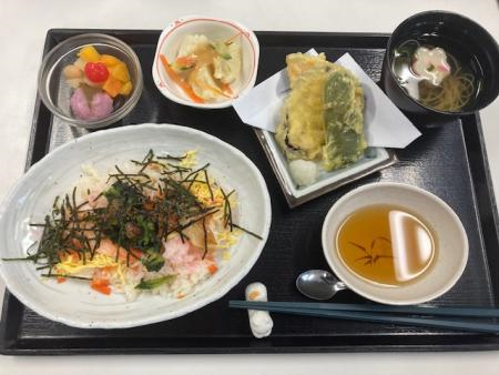 2024年03月03日(日) ☆ ひなまつり ☆ 今日は3月3日 桃の節句ですね というわけで ちょっと豪華な 「ひなまつり御膳」で 施設でもお祝いです いくらとえび、あなごののった 海鮮ちらし寿司 ピーマン、なす、 かぼちゃの天ぷら、 カリフラワーの酢味噌あえ、 すまし汁 ちいさな桜餅とフルーツつきです 程よい量で、 入居者の皆様も 完食されていました 桜餅に喜ばれる方が 多かったです