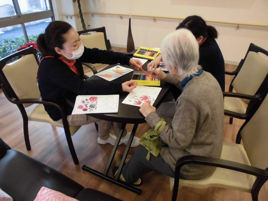 2014年11月16日(日) 塗り絵 こんにちは最近寒くなって夜の帰り道を走って少し怪しげな羽立でございます 本日のレクリエーションは「大人の塗り絵」でした手先や視覚を刺激してリハビリになるそうです これが、なかなか繊細なタッチが求められやってみるとつい夢中になってしまいますね ほかにも日替わりで脳トレドリルや漢字パズル等も施設サービスの レクリエーションで企画してます ご入居者様も募集しておりますのでお気軽にアルファリビング福岡原にお越しください