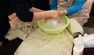 あったかいお湯の中でハンドマッサージ