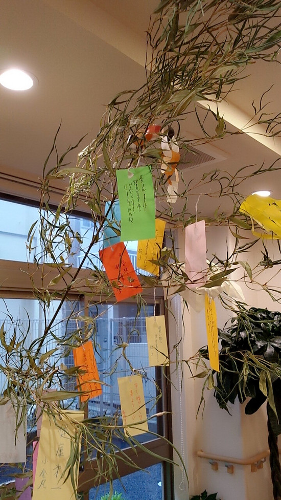 2015年07月04日(土) 七夕飾り☆ こんにちはアルファリビング福岡原です本日は台風の影響もあってか1日雨模様でした施設では続々と七夕飾りがすすんでいますみなさんご家族想いの素敵な願い事を書かれていました