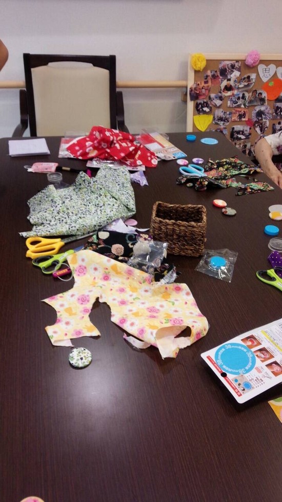 2015年10月03日(土) 手芸レク こんにちはアルファリビング福岡原です 本日は手芸レクでヘアーゴムの飾りを作成しました 細かい作業ですが皆様、とても手際よく作られましたよ 完成したひとつを職員につけてくださいました とてもかわいく出来きましたプレゼントしてくださいましたので 大事に使いたいと思います