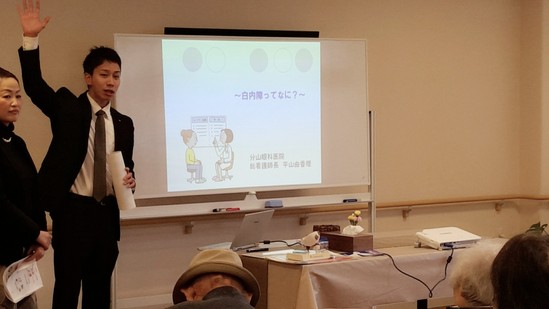 2016年01月14日(木) 眼の病気予防セミナー こんにちはアルファリビング福岡原です本日は分山眼科の方にお越しいただき白内障など眼の病気の予防についてお話して頂きました白内障の手術を受けたことのある方も多く皆様興味津々お話も分かりやすかったと大変好評でした
