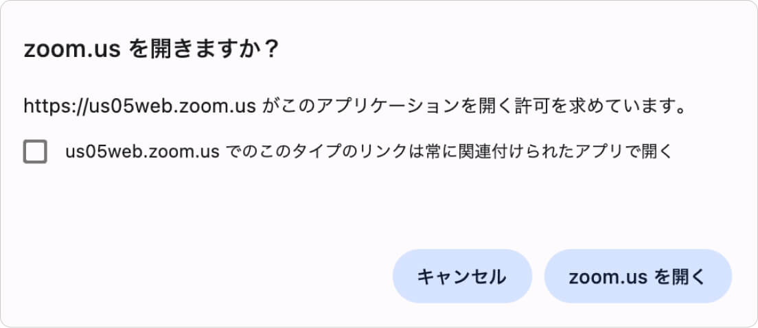 Zoomがインストールされた状態で招待リンクを開くとポップアップメッセージが表示されます。「zoom.usを開く」をクリックしてください。