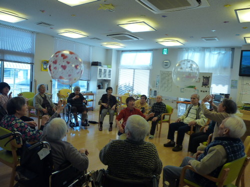 いつもは、風船を1個だけ使ってするのですが、今日は2個使ってレクをやってみました。