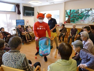 デイサービスでは赤鬼が持っているカゴにボールを入れるゲームを