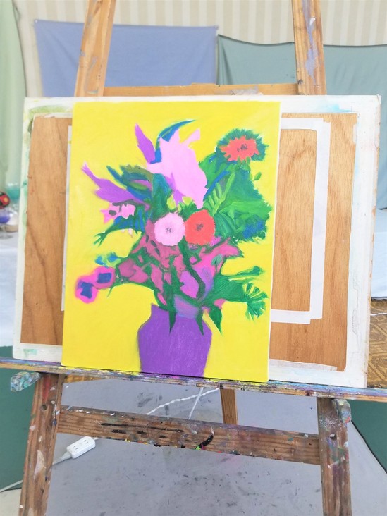 2021年11月20日(土) 画廊にて 暖かい一日となり汗ばむ陽気となりました! 秋真っ最中の今日この頃。如何お過ごしでしょうか? 最近、お風呂に湯船を入れる温度は43度が最高に気持ちよく感じる… ご存知!外林でございます!! 本日の投稿は素敵な絵のご紹介です!当施設に入居されていますY様が、福山市内の絵画教室に通われており、絵画教室のお迎えに行った際に、撮影した作品のご紹介でございます! Y様の作品は、当施設のエントランスに飾ってもあり、ブログ内でも何度かご紹介したこともございます!実際に、画廊でキャンパスに注ぐ眼差しは、熱く熱く素敵な姿がそこにありました!いつもと違う姿を見れて、私も嬉しかったです! 当施設の画伯Y様!いつもエントランス周りを、華やかにする絵をありがとうございます!これから寒い季節に入り、外出が大変になりますが、お体に気を付けてお過ごしくださいませ。(^_-)-☆