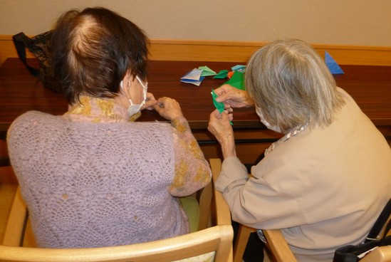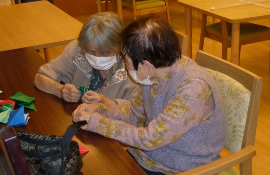 2023年11月15日(水) 広がる輪 おはようございます!気づけば11月ももう折り返し地点!皆様気温差にお気をつけてお過ごしでしょうか? 今年はついに秋の涼しい気候がありませんでしたね。橋本です。 さて、今回はそんな温度差にも負けず、入居者様たちの元気なお姿を紹介致します! 夕食後、普段あまり絡んでいるところを見ないお二方が並んで何かしているので、見に行ってみると…?折り鶴をおられていました!さらに、どうやら一緒に折っているだけではなく、折り方が分からないものは分かる方が教えるなど、お互いに教えあって折っているではありませんか!なんだか感動ですさらにさらに、夕食を終えた他の入居者様が「がんばれよ」と一声かけていったり、一緒になって折る人が現れたり…2人で始めた折り紙ですが、周りに一人二人と増え…気づけば大団円!僕の勝手なイメージですが、これぞ理想の介護福祉施設!こういうのをどんどん増やしていきたいですね~。