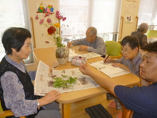 2014年10月11日(土) 生け花をして下さいました 花の好きなお客様に施設の庭に咲いたコスモスを花瓶に生けていただきました! 玄関ホールがとても素敵に華やかになりました。 今後も、よろしくお願いいたします!^^