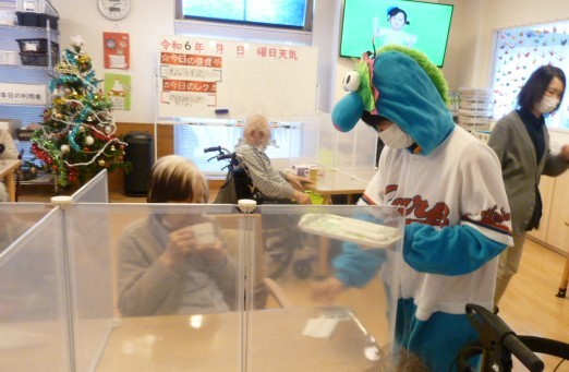 入居者様にサンタクロース姿でプレゼントをお渡しすると