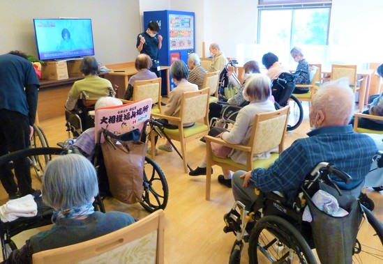 ここアルファリビング福山多治米では、毎週日曜日にアルファサンデーが開催されます。昼食後、皆さんで集まり体操や脳トレなどを行います。
