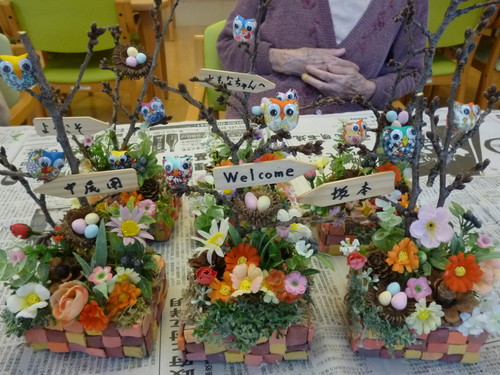 みんなが作った作品を並べてみました。お花の配置、木にとまっているフクロウの配置などみんな個性が出てます