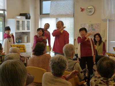 初まりの歌から終わりの歌まで美しい声や楽器のハーモニーと共に利用者様も笑顔で参加してくださいました。