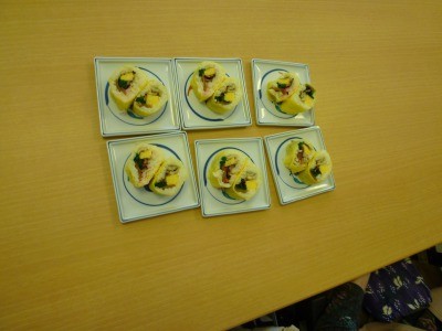 昼食時に恵方巻きがでたので、海苔を巻く代わりに卵焼きを巻きました。