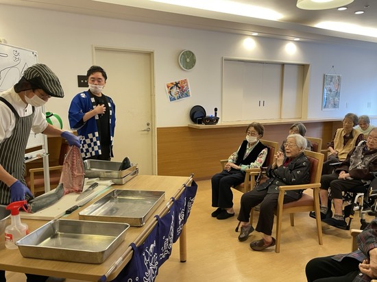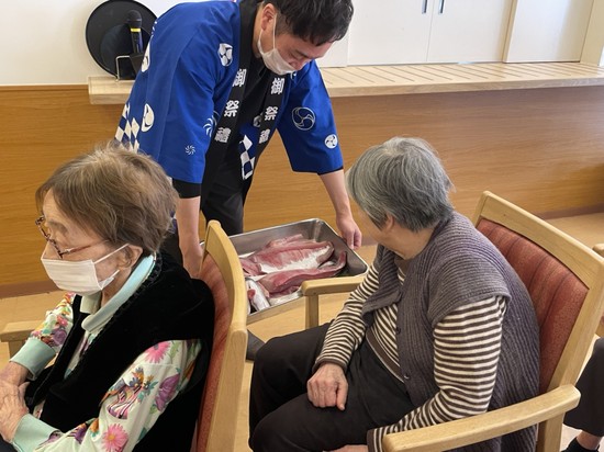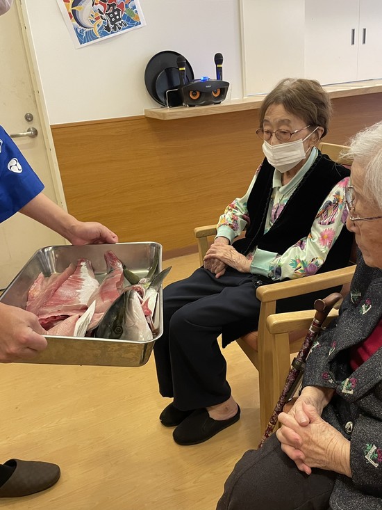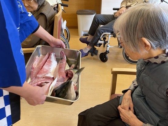 2025年02月01日(土) 【アルファリビング広島段原】ぶりの解体ショー② ぶりの解体ショー② ぶりの解体ショーを見て、嬉しそうな方、気持ち悪そうにされておられる方、色々な表情が見えました。 切り身を上にあげて見せられる度に、「うわぁぁぁぁぁぁぁ」 と声が上がり、拍手が響きます。解体が終わったぶりを近くでご覧いただきましたさあ!お昼ご飯は海鮮丼です ぶりの解体ショー③につ・づ・く・・・
