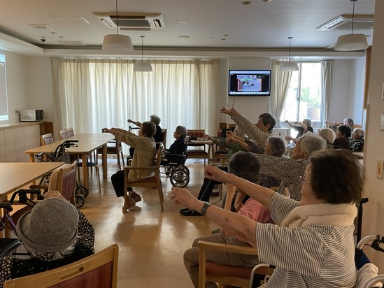 2025年08月19日(火) 【アルファリビング広島段原】オンライン体操頑張ってます こんにちは アルファリビング広島段原です 一人で体操を と思ってもなかなか腰が上がらないものです・・・ でもこちら↓↓↓皆さんと一緒なら、頑張れるんですよね ( *´艸`)すごく、一生懸命に手を挙げておられます腕を上げるだけでも、なかなか大変だと思いますが、皆さん、普通にこの姿勢をキープされていましたこれは、盆踊りが期待できますね・・・\(^o^)/
