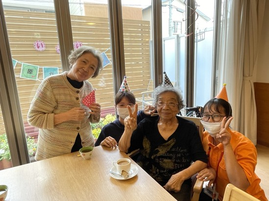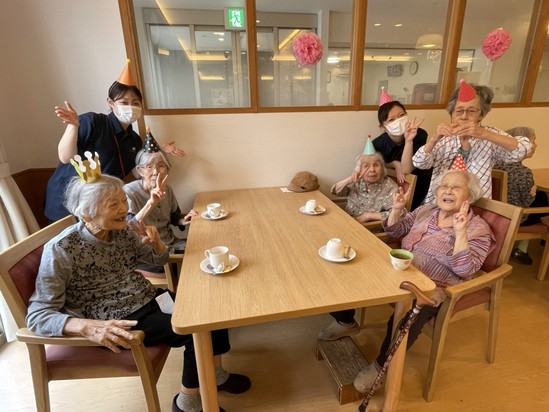 2025年09月24日(水) 【アルファリビング広島段原】デザートバイキング① こんにちは アルファリビング広島段原です みなさんが待ちに待ったデザートバイキングを開催しました デザートが登場するまで、記念撮影で大盛り上がりしましたみなさん、小さな三角帽子がお似合いですね 頭に載せて、ハイピース ケーキはまだかしら?( *´艸`)