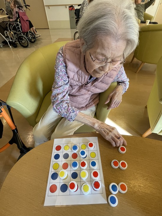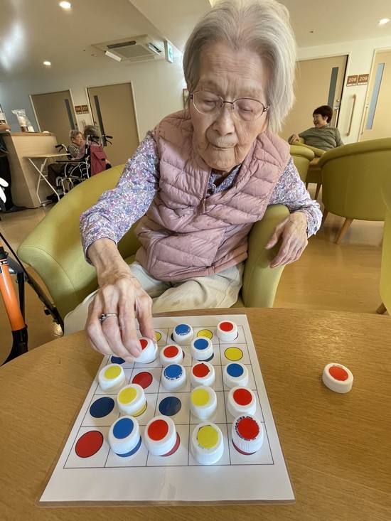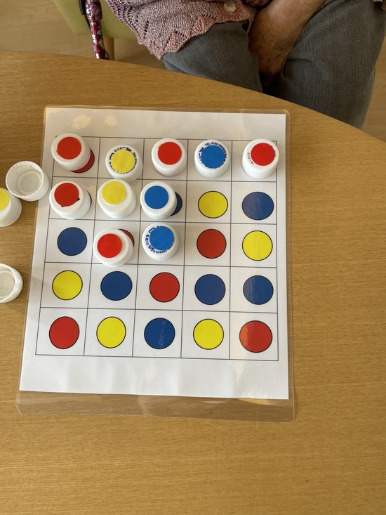 色のシールが貼ってあるキャップを同じ色のところに置いて、認知機能訓練を行っています