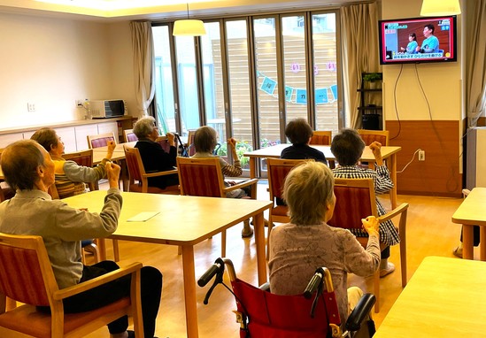 2025年11月19日(水) 【アルファリビング広島段原】オンライン体操! こんにちは アルファリビング広島段原です 毎月第2水曜日の14時半から段原地域包括支援センター主催のオンライン体操に参加しています 皆さま、テレビ映像を見ながら集中して手や足を動かしておられますね 色々な運動で健康な身体を維持していきましょう!!(*^^)v