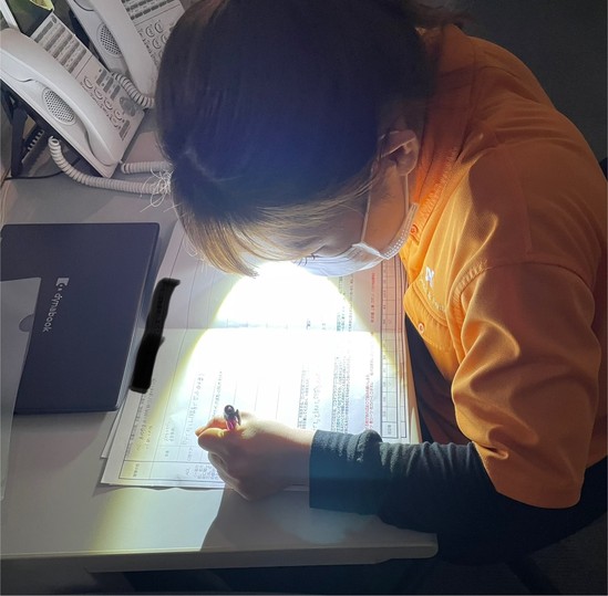 熱心なスタッフは懐中電灯をつけての作業です。