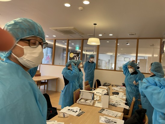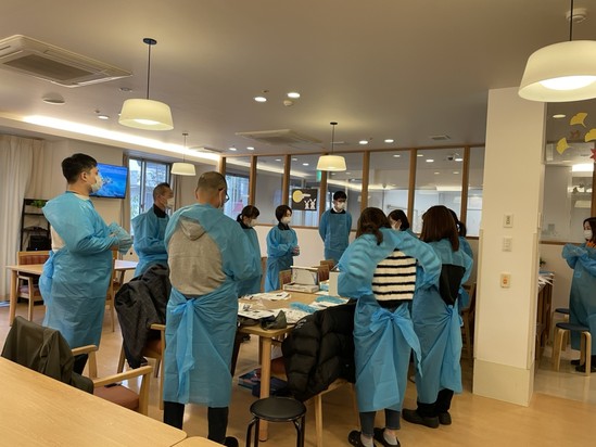 万が一、感染者が出ても施設内で広がらない様に、いざという時の為にスタッフ全員でガウンの着脱の練習をしました。