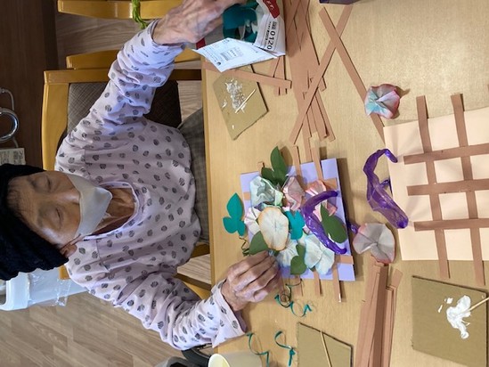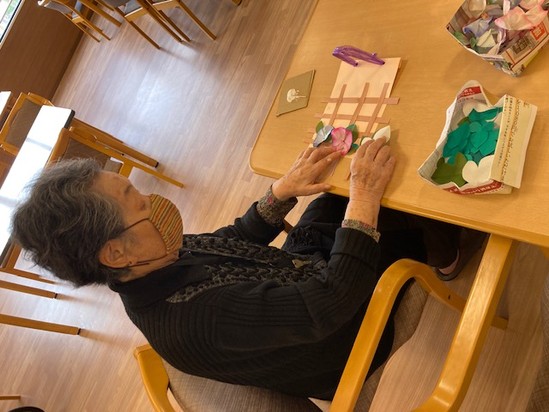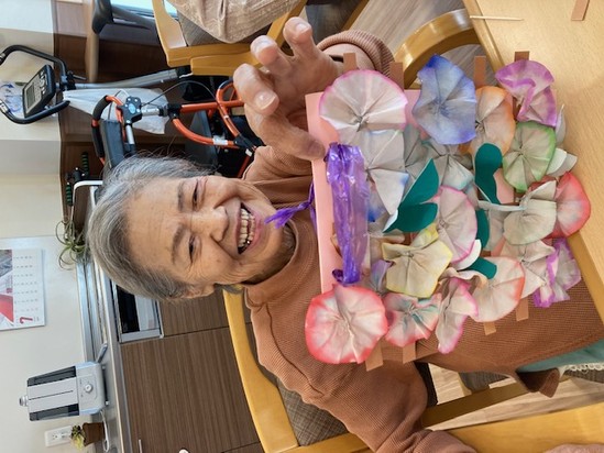 竹垣に見立てたものに朝顔のはなびらを貼っていきます♬