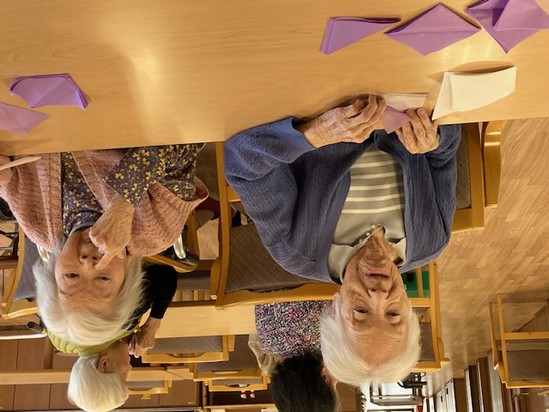 2025年04月07日(月) 春はお花がきれいです♪ こんにちは!古江駅前です(*'ω'*)この週末はお花見に行かれた方も多いと思います。春はいろいろなお花が見ごろになります!これから外出が楽しくなりますね♪本日古江駅前では花びらの制作をいたしました♡ 紫や白のおはながみを三角に折って花びらをつくります(^^♪ さんかく、さんかく、さんかくに折ります♪ 職員の見本をみながら、さんかく、さんかく♡ 本日、入職した新人職員もレクに参加いたしました! 本日、皆様につくっていただいたはなびら!どのように完成するのか楽しみですね!