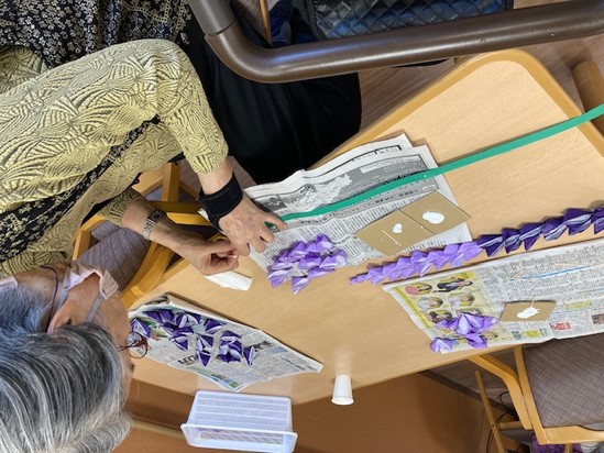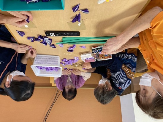 皆様で作成した花びらをのりで付けて作品にしていきます♡