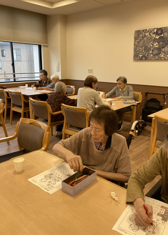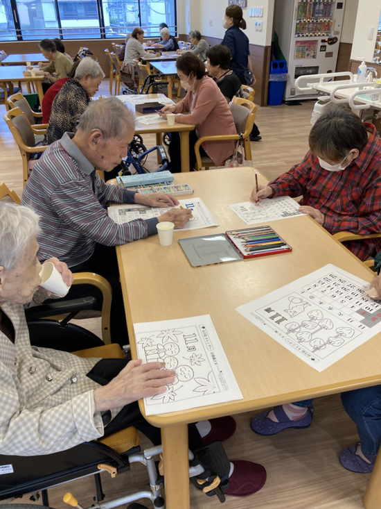 2025年10月22日(水) 11月のカレンダー塗り絵 こんにちは、古江駅前です 11月のカレンダー塗り絵をして頂きました。 カレンダー塗り絵は人気のレクリエーションです。 夕食の時間まで皆様熱心に塗って頂きました。